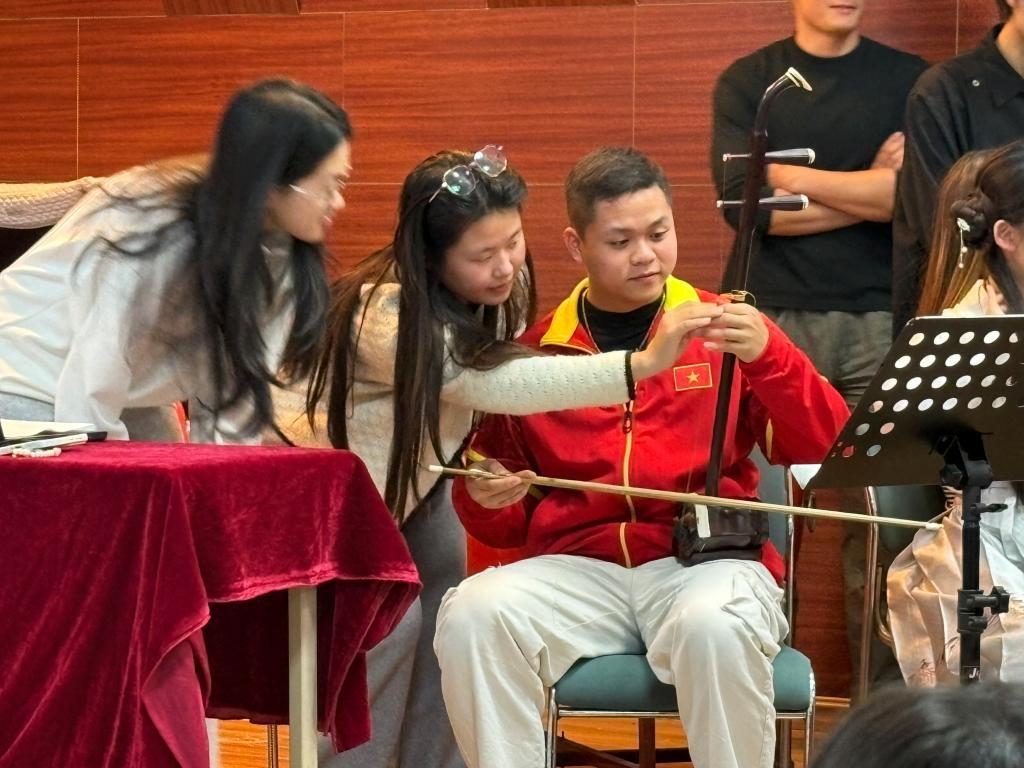 At the event site, the Youth National Orchestra presented classic repertoire performances on Chinese folk instruments such as the yangqin (a hammered dulcimer) and erhu (a two-stringed fiddle). The gentle and melodious strings of the pipa (a four-stringed lute) and the high-pitched and resonant tunes of the suona (a double-reed wind instrument) won warm applause from the international students. Teacher Yao Jinjia also elaborated on the historical origins, structural characteristics and playing techniques of the instruments, guiding the students to observe and experience them up close.