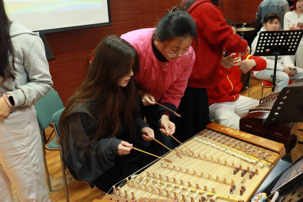 After the performance, the international students took the stage to experience playing various instruments. They actively participated, trying their hands at playing the guzheng (a zither-like instrument), tanggu (a barrel drum), di (a bamboo flute) and sheng (a mouth organ) under the guidance of the orchestra members, personally unlocking the joy of folk music.